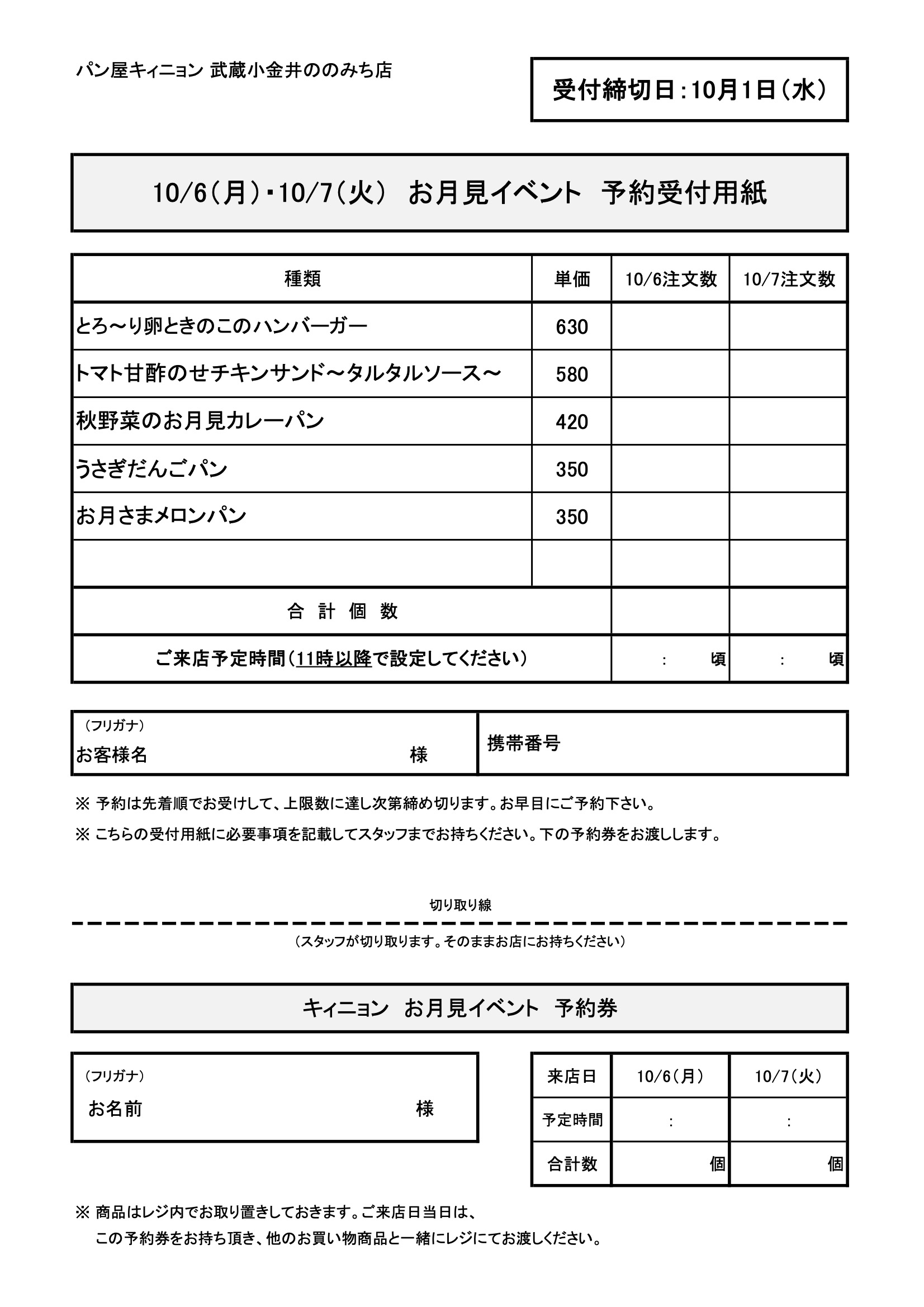 下の予約受付用紙をプリントアウトし、必要事項をご記入のうえ店頭へお持ちください。