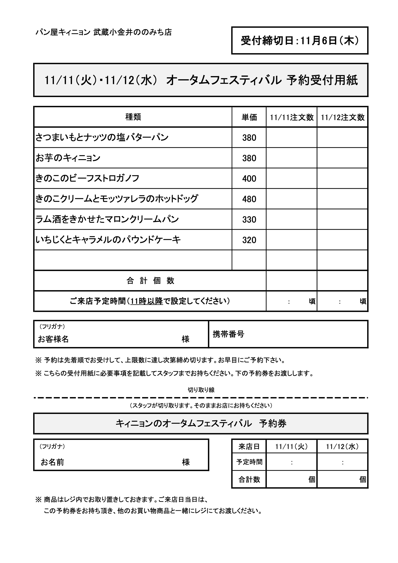 下の予約受付用紙をプリントアウトし、必要事項をご記入のうえ店頭へお持ちください。