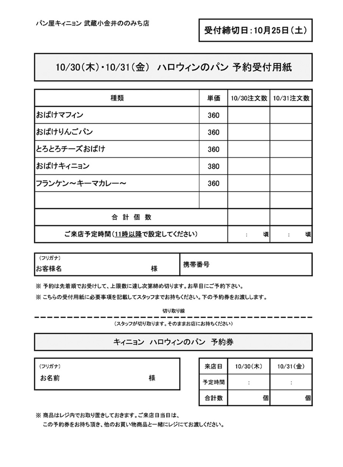 下の予約受付用紙をプリントアウトし、必要事項をご記入のうえ店頭へお持ちください。