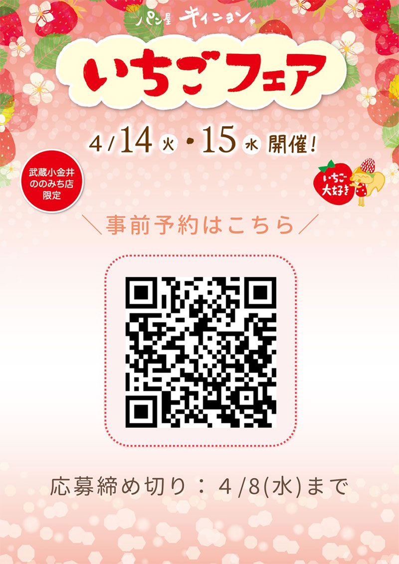 4月14日(火)・15日(水)の2日間限定で武蔵小金井ののみち店にて「いちごフェア」を開催します♪